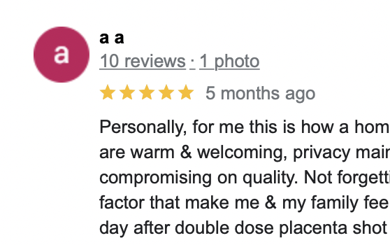 Personally, for me this is how a home clinic done right, very personalized treatment throughout. People are warm & welcoming, privacy maintained thoroughly, while price pushed on the down low without compromising on quality. Not forgetting the pretty garden+cute dog as backdrop. Definitely some of the factor that make me & my family feel assured. Last but no least is the obvious result; my skin felt nicer a day after double dose placenta shot while NAD IV unexpectedly gives my metabolism a good kick. Now three days after the procedure, started noticing how my hair have stopped falling out in shower. Chef's kiss! Now, if only I can get this done monthly...